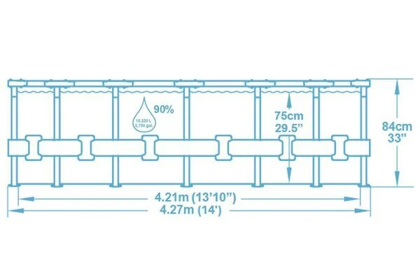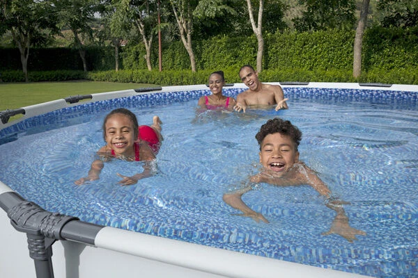 Gefertigt aus dem speziellen TriTech Material des Herstellers ist der Pool sowohl belastbar, strapazierfähig, als auch sehr langlebig, sodass Sie viele Sommer den heimischen Badespaß genießen können. Die extrem starre, ovale Rahmenkonstruktion mit Korrosionsschutz sorgt für eine erhöhte Festigkeit und Haltbarkeit. Das von außen, einmal komplett um den Pool gehende PVC-Band sorgt für extra Stabilität der Seitenwände. Der ca. Ø 427 x 84 cm große Pool kann mit maximal 10220 Liter gefüllt werden und bietet so für mehrere Personen ausreichend Platz. Die Innenwand ist in einer ansprechenden Mosaikoptik gehalten und sorgt für rundum schönes Badevergnügen. Mit im Lieferumfang enthalten sind neben der Filterpumpe, eine passende Filterkartusche, die benötigten Schlauchverbindungen und ein selbstklebender Reparaturflicken.