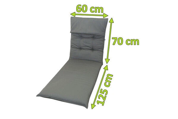 Der Bezug wird aus 100% Acrylfaser (Dralon®) mit Teflon® Markenimprägnierung gefertigt und bietet, dank des klassischen Designs in Grau und den ziervollen Steppnähten, ein optisches Highlight für Ihre Sonnenliegen. Durch das Haltegummi an der Rückseite und die Bindekordeln an der Sitzfläche lässt sich die Auflage kinderleicht fixieren und beugt so unnötigem Verrutschen vor, auch wenn die Liege über eine glatte Oberfläche verfügt. Dank der Maße von ca. 195 x 60 cm passt sich die Auflage perfekt an die meisten Liegen und bietet maximalen Komfort. Dieser ist selbstverständlich nicht nur auf die Länge zu reduzieren – dafür sorgt ebenfalls der weiche, ca. 8 cm starke Kern, bestehend aus einer Schaum- und Polyestervliesfüllung. Diese edle Auflage macht beim Sonnen stets eine gute Figur.