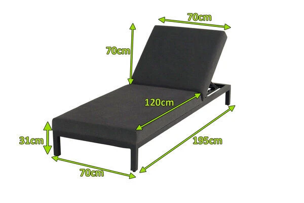 Auf dieser Liege können Sie mit einem gemütlichen Buch in der Sonne liegen und nach einem langen Arbeitstag entspannen. Hierzu brauchen Sie einfach nur Platz zu nehmen und sich mithilfe der Rasterschiene problemlos eine bequeme Liege- oder Sitzposition einstellen. Die Liege hat ein Gesamtmaß von ca. 195 x 70 cm, die Sitzhöhe beträgt ca. 31 cm inkl. Kissen – so kommt die Entspannung beim Hinlegen von ganz allein. Sie überzeugt durch das Gestell aus pulverbeschichtetem Aluminium in Schwarz in Verbindung mit Sunbrella in der Farbe sooty. Das Zusammenspiel der verwendeten Materialien gibt der Liege ihr einzigartiges und hochwertiges Aussehen. Dank der robusten Materialien kann sie problemlos das ganze Jahr über im Freien stehen bleiben. Das Gestell aus robustem Aluminium sorgt für ein geringes Eigengewicht von nur ca. 16,8 kg, sodass sich die Liege kinderleicht verschieben oder an die gewünschte Position tragen lässt. So können Sie jederzeit flexibel entscheiden, ob Sie lieber in der Sonne oder im Schatten entspannen wollen.