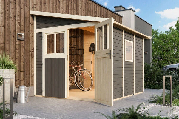 1x KARIBU Anlehnhaus Bomlitz 3 , terragrau , ca. 255 x 268 x 243 cm