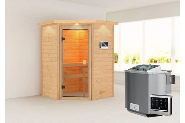 1x KARIBU 38 mm Sauna Antonia mit Eckeinstieg, Dachkranz und bronzierter Tür in verschiedenen Ausführungen inkl. Montageanleitung und -material