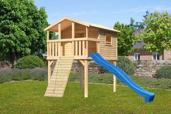 Das riesige Stelzenhaus Frieda von KARIBU in wahlweise terragrau oder naturbelassen, überzeugt mit extrem hoher Stabilität. Die Grundkonstruktion aus ca. 9 x 9 cm starken Massivholzpfosten ist für eine höhere Witterungresistenz kesseldruckimprägniert und bestehen aus Fichtenholz. Die ca. 19 mm dicken Wandbretter und das Dach sowie die Fußbodenbretter sind ebenfalls aus Holz hergestellt. Die Wandbretter werden im einfachen Steck/-Schraubsystem montiert, sodass schnell der neue Traum Ihrer Kinder im eigenen Garten steht. Das ist auf der Längsseite mit einem Brüstungselement, ebenfalls aus nordischer Fichte, versehen und bietet so ausreichenden Schutz. Die Podesthöhe von ca. 150 cm eignet sich ideal für Kinder jeder Altersklasse. Die Tür- und Fensteröffnungen sind aus Sicherheitsgründen nicht verschlossen. Auch das Haus Frieda hat ein Zertifikat vom TÜV-Nord für geprüfte Sicherheit (GS) nach DIN EN 71-1, DIN EN 71-3, DIN EN 71-8 und AfPS GS 2014. Auch können Sie die Farbe der Rutsche gemäß der Lieblingsfarbe Ihres Kindes eigens bestimmen. Weitere Varianten finden Sie in der Auswahl, sodass Sie auch dieses Haus nach Ihren Wünschen entsprechend gestalten können. Das riesige Zubehörsortiment sorgt dafür, dass Ihrer Phantasie keine Grenzen gesetzt sind. Als besonderes Highlight sind die außergewöhnlich schönen Farbsets zu nennen, die es Ihnen erlauben, das Stelzenhaus Frieda komplett einzigartig zu machen. Lassen Sie sich in der entsprechenden Zubehörrubrik inspirieren.