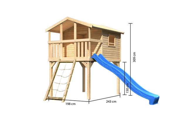 Das riesige Stelzenhaus Frieda von KARIBU in wahlweise terragrau oder naturbelassen, überzeugt mit extrem hoher Stabilität. Die Grundkonstruktion aus ca. 9 x 9 cm starken Massivholzpfosten ist für eine höhere Witterungresistenz kesseldruckimprägniert und bestehen aus Fichtenholz. Die ca. 19 mm dicken Wandbretter und das Dach sowie die Fußbodenbretter sind ebenfalls aus Holz hergestellt. Die Wandbretter werden im einfachen Steck/-Schraubsystem montiert, sodass schnell der neue Traum Ihrer Kinder im eigenen Garten steht. Das ist auf der Längsseite mit einem Brüstungselement, ebenfalls aus nordischer Fichte, versehen und bietet so ausreichenden Schutz. Die Podesthöhe von ca. 150 cm eignet sich ideal für Kinder jeder Altersklasse. Die Tür- und Fensteröffnungen sind aus Sicherheitsgründen nicht verschlossen. Auch das Haus Frieda hat ein Zertifikat vom TÜV-Nord für geprüfte Sicherheit (GS) nach DIN EN 71-1, DIN EN 71-3, DIN EN 71-8 und AfPS GS 2014. Auch können Sie die Farbe der Rutsche gemäß der Lieblingsfarbe Ihres Kindes eigens bestimmen. Weitere Varianten finden Sie in der Auswahl, sodass Sie auch dieses Haus nach Ihren Wünschen entsprechend gestalten können. Das riesige Zubehörsortiment sorgt dafür, dass Ihrer Phantasie keine Grenzen gesetzt sind. Als besonderes Highlight sind die außergewöhnlich schönen Farbsets zu nennen, die es Ihnen erlauben, das Stelzenhaus Frieda komplett einzigartig zu machen. Lassen Sie sich in der entsprechenden Zubehörrubrik inspirieren.