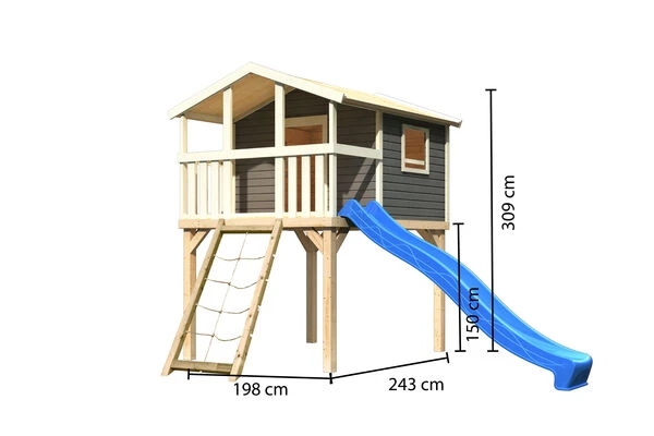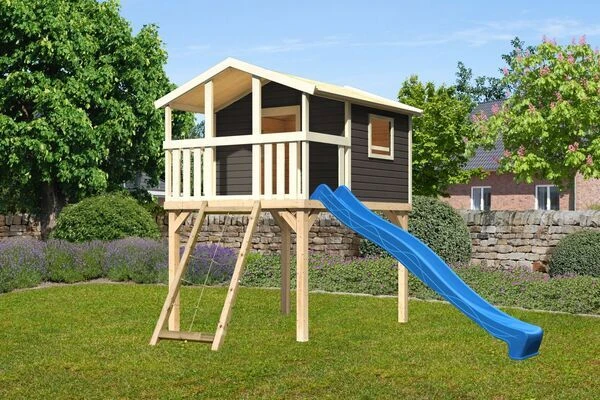 Das riesige Stelzenhaus Frieda von KARIBU in wahlweise terragrau oder naturbelassen, überzeugt mit extrem hoher Stabilität. Die Grundkonstruktion aus ca. 9 x 9 cm starken Massivholzpfosten ist für eine höhere Witterungresistenz kesseldruckimprägniert und bestehen aus Fichtenholz. Die ca. 19 mm dicken Wandbretter und das Dach sowie die Fußbodenbretter sind ebenfalls aus Holz hergestellt. Die Wandbretter werden im einfachen Steck/-Schraubsystem montiert, sodass schnell der neue Traum Ihrer Kinder im eigenen Garten steht. Das ist auf der Längsseite mit einem Brüstungselement, ebenfalls aus nordischer Fichte, versehen und bietet so ausreichenden Schutz. Die Podesthöhe von ca. 150 cm eignet sich ideal für Kinder jeder Altersklasse. Die Tür- und Fensteröffnungen sind aus Sicherheitsgründen nicht verschlossen. Auch das Haus Frieda hat ein Zertifikat vom TÜV-Nord für geprüfte Sicherheit (GS) nach DIN EN 71-1, DIN EN 71-3, DIN EN 71-8 und AfPS GS 2014. Auch können Sie die Farbe der Rutsche gemäß der Lieblingsfarbe Ihres Kindes eigens bestimmen. Weitere Varianten finden Sie in der Auswahl, sodass Sie auch dieses Haus nach Ihren Wünschen entsprechend gestalten können. Das riesige Zubehörsortiment sorgt dafür, dass Ihrer Phantasie keine Grenzen gesetzt sind. Als besonderes Highlight sind die außergewöhnlich schönen Farbsets zu nennen, die es Ihnen erlauben, das Stelzenhaus Frieda komplett einzigartig zu machen. Lassen Sie sich in der entsprechenden Zubehörrubrik inspirieren.