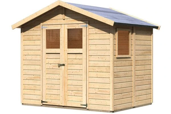 Das KARIBU-Gartenhaus Dalin 1 aus nordischem Fichtenholz wird aus 14 mm Wandbrettern im Steck-/Schraubsystem gefertigt und kann somit schnell und einfach aufgebaut werden. Das praktische Satteldach sorgt dafür, dass das Gartenhaus schnell und wirkungsvoll gegen Witterungseinflüsse geschützt ist. Das Haus hat eine Grundfläche von ca. 4,4 m² und 8,1 m³ umbauten Raum. Dank der Seitenhöhe von ca. 182 cm und einer Firsthöhe von ca. 231 cm sorgt das Gartenhaus innen für reichlich Platz. Das Gartenhaus hat ein Sockelmaß von ca. 245 x 177 cm. Kesseldruckimprägnierte Bodenbalken sorgen für optimalen Schutz gegen aufsteigende Feuchtigkeit. Durch die Positionierung unter dem Gartenhaus schützen die Bodenbalken effektiv vor Staunässe und Spritzwasser. Das Gartenhaus wird mit der, praktischerweise schon vormontierten Tür, im stabilen Massivholzrahmen ausgeliefert und bietet dank der großen Öffnung bequemen Zutritt in das Haus. Nebenbei bietet das Haus Dalin 1 effektiven Schutz vor Diebstahl. Gleichzeitig lassen die großzügigen Lichtausschnitte im jeweiligen Türflügel reichlich Tageslicht in das Gartenhaus einströmen.