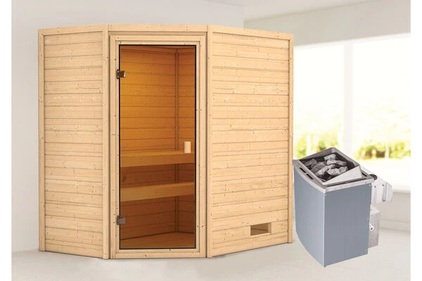 Sauna Jella aus Fichtenholz mit Eckeinstieg in verschiedenen Ausführungen von KARIBU