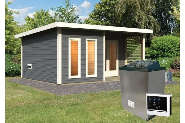 1 x KARIBU Mainburg 5 Saunahaus, terragrau, Fichte, 508x368x253 cm, SET A mit Doppelflügeltür, Terrasse und 9 kW Ofen