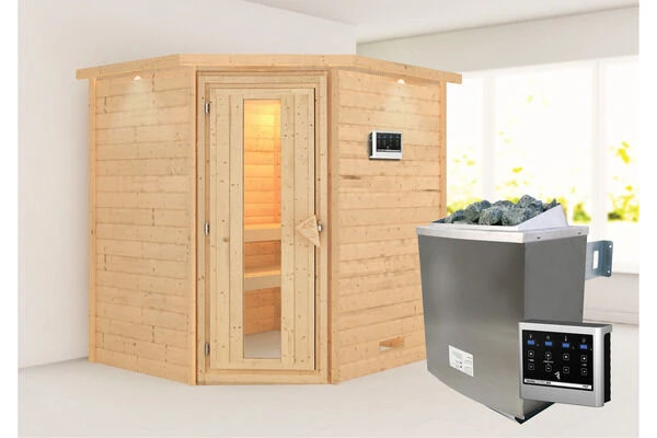 1x KARIBU 38 mm Sauna Mia mit Eckeinstieg, Energiespartür und Dachkranz in verschiedenen Ausführungen inkl. Montageanleitung und -material