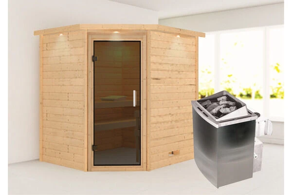 1x KARIBU 38 mm Sauna Mia mit Eckeinstieg, graphitfarbener Tür und Dachkranz in verschiedenen Ausführungen inkl. Montageanleitung und -material