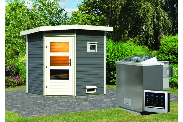 Saunahaus Pekka terragrau aus Fichtenholz mit Eckeinstieg in verschiedenen Ausführungen von KARIBU