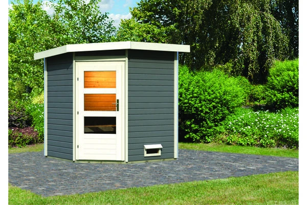 Saunahaus Pekka terragrau aus Fichtenholz mit Eckeinstieg in verschiedenen Ausführungen von KARIBU