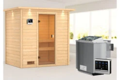 Die KARIBU 38 mm Sauna Selena mit Fronteinstieg ist ideal für niedrige Deckenhöhen geeignet. Das Modell verfügt über eine Grundfläche von ca. 2,5 m² und einem umbauten Raum von ca. 4,4 m³. Das Außenmaß beträgt nur ca. 195 x 145 x 187 cm, das Innenmaß ca. 185 cm x 135 x 180 cm. Mit Dachkranz ist das Außenmaß ca. 223 x 159 x 191 cm. Die Sauna wird mit Wandbrettern im Steck-/Schraubsystem gefertigt und kann somit rasch und einfach aufgebaut werden.