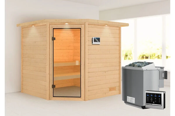 1x KARIBU 38 mm Sauna Tilda mit Eckeinstieg, inkl. Dachkranz und bronzierter Tür in verschiedenen Ausführungen inkl. Montageanleitung und -material