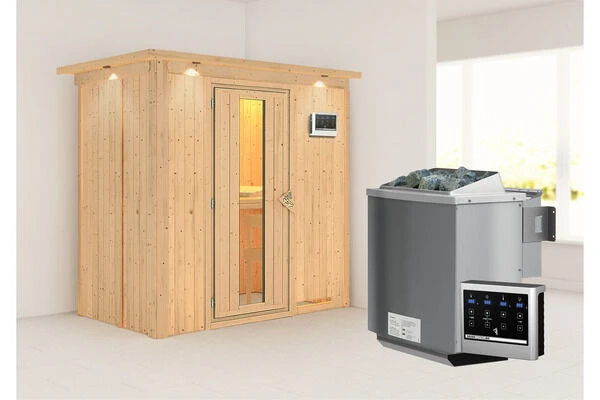 1x KARIBU Variado Sauna, naturbelassen, Fichte, ca. 210 x 132 x 202 cm, Fronteinstieg, mit Energiespartür, SET mit Ofen 4,5 kW Bio ext. Strg.