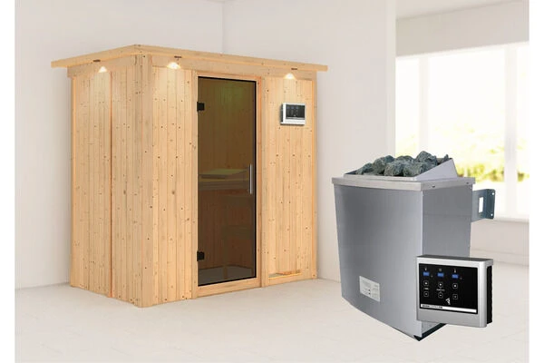 Sie haben die Möglichkeit dieses Modell nach Ihren Wünschen auszurüsten: ob mit einem 4,5 kW Ofen mit integrierter Steuerung, einem 4,5 kW Ofen mit externer Steuerung oder einem 4,5 kW Bio-Kombiofen mit externer Steuerung. Auch die Option Ihre Sauna mit einem Dachkranz inkl. 3 LED Strahler auszustatten steht Ihnen zur Verfügung. Somit können Sie das Raumklima und die Optik der Sauna individuell an Ihre Vorlieben anpassen.