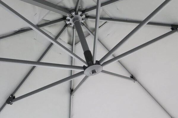Die Twist-Funktion dieses Ampelschirms ermöglicht eine besonders komfortable Einstellung des Schirmdachs, so dass Sie es immer genau dem Sonnenstand entsprechen ausrichten können: