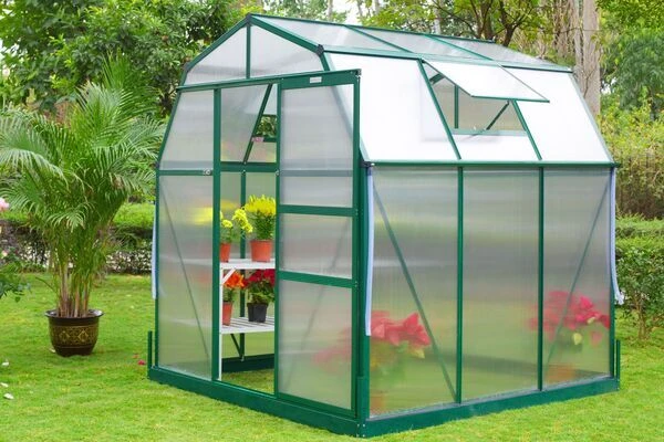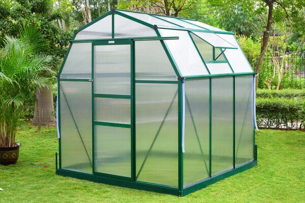 Gewächshaus von OUTFLEXX® aus grünem Aluminium und Hohlkammerplatten aus ca. 6 mm Polycarbonat