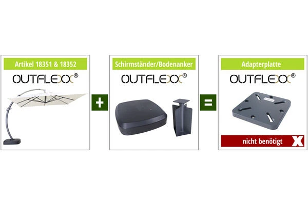 Wichtige Information: Dieser Schirm kann ohne Adapterplatte mit unseren OUTFLEXX® Schirmständern oder dem OUTFLEXX® Bodenanker kombiniert werden.