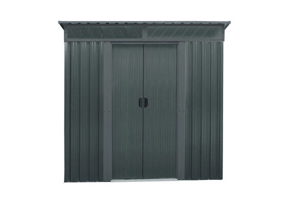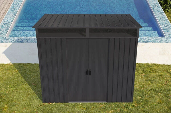 Der Türdurchgang des Gerätehauses hat eine Gesamtbreite von ca. 103 cm und eine Höhe von ca. 173 cm. Der Durchgang ist mit zwei Schiebetüren besetzt, was die Nutzung des Türdurchganges ermöglicht, ohne dass die Türen in den Transportweg hineinragen. Auf der Frontseite des Hauses befinden sich über der Tür zwei Kunststoffscheiben aus Polycarbonat (PC). Das durchsichtige Material ermöglicht den Einfall von natürlichem Licht, so dass der Innenraum des Gerätehauses im Laufe des Tages bereits merklich erhellt ist. Die Grundfläche des Gartenhauses beträgt ca. 4,05 m².Die Wände und das Dach des Hauses tragen die Farbe anthrazit. Durch die gedeckte Farbe fügt sich das Gerätehaus dezent in seine Umgebung ein.