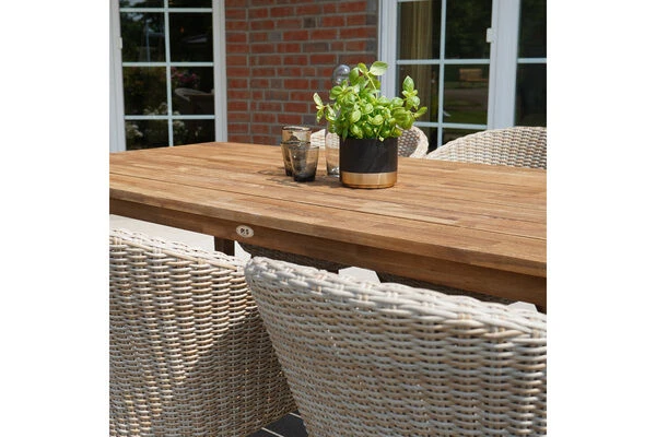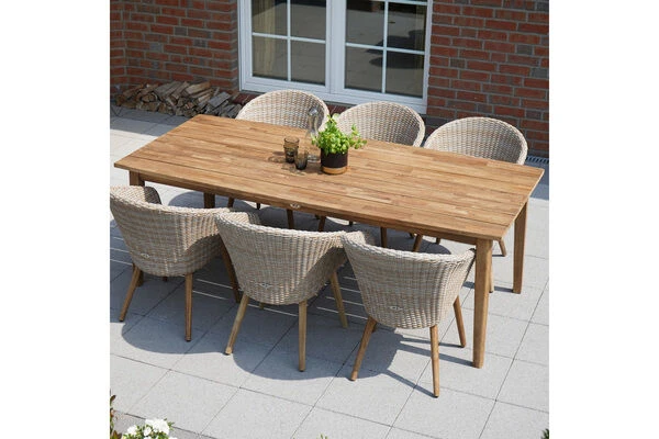 Dieser zeitlose Gartentisch hat Maße von ca. 220 x 100 x 74 cm und bietet so eine ausladende Abstellfläche. Hier können Sie bequem Ihr Mittag- oder Abendessen zu sich nehmen oder zu einem gemütlichen Grillabend laden. Mit einer Stärke von ca. 3 cm hält die Tischplatte eine tägliche Nutzung ohne Probleme aus. Mit einer Unterschubhöhe von ca. 67 cm lassen sich so gut wie alle gängigen Gartenstühle unter die Tischplatte schieben.